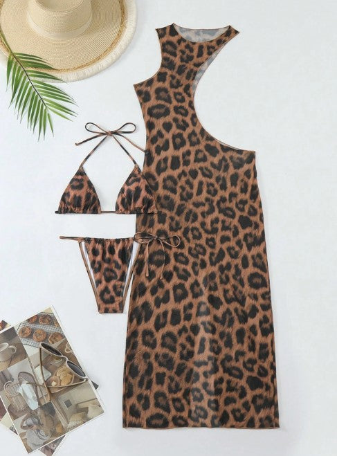 Women’s Leopard Print Halter 3pc Bikini Set With Cover-Up Dress